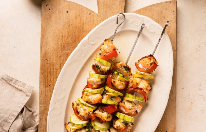 Enfilez sur des piques avec des légumes (courgettes, oignons, tomates cerises…).