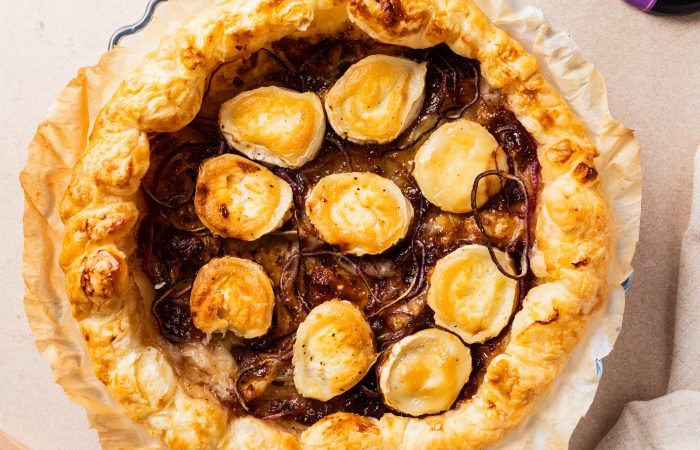 Étalez la confiture de figues sur le fond de tarte. Répartissez ensuite les oignons émincés, puis disposez les rondelles de chèvre par-dessus.